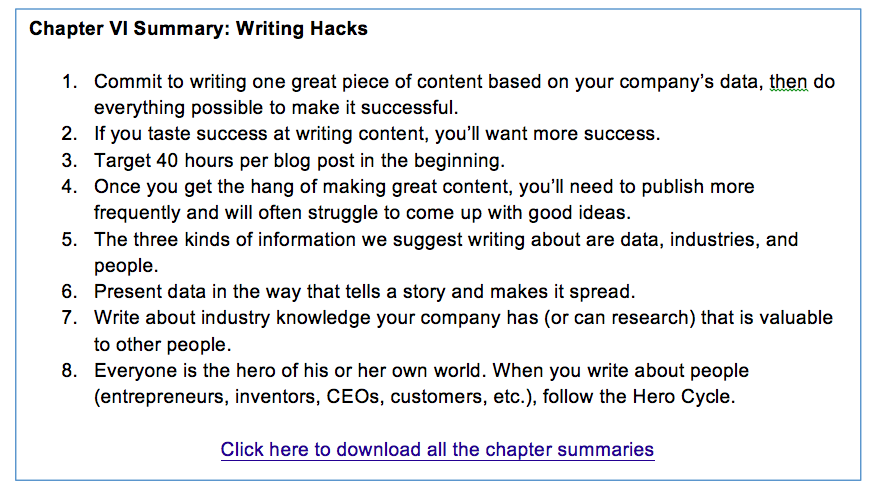 To download all the chapter summaries and a "one-page writer's checklist", click here.