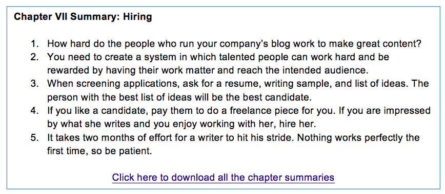 It’s a lot of work to find the right people and train them. But there is a reason that most corporate blogs get no traffic: if it were easy, everyone would be doing it! Throughout this book, we’ve argued that there is a fundamental change going on, and that there is a level playing field for content creators. The time to take advantage of that and pour your heart into making awesome content is now.