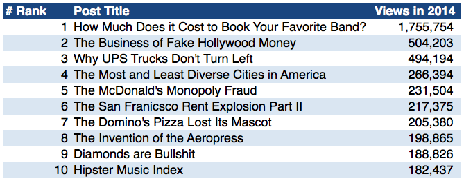 That day, a Priceonomics writer dashed off a short blog post called “How Much Does it Cost to Book your Favorite Band?” The post -- a price list of the approximate booking costs of hundreds of bands -- wasn’t our most exciting piece of writing, but it went more viral than anything we’d ever posted.