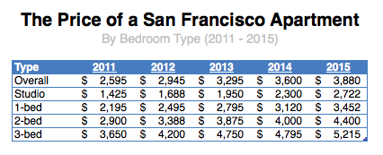 Over the last 4 years, prices have dramatically increased in San Francisco. From 2011 to 2015, the median price of an apartment in the city has increased 50% from $2,595 to $3,880.