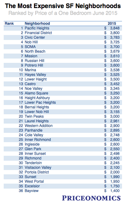 As you search for your apartment in San Francisco, you might find this Priceonomics rent cheat sheet handy. It provides the median price of an apartment (as of the end of June 2015) for a studio or a one, two or three-bedroom apartment in each neighborhood.