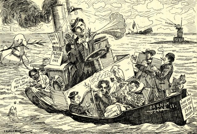 A political cartoon mocks Henry Ford’s “Peace Ship”, which carried Ford and peace activists on an unsuccessful and widely-mocked effort to get Europeans to end World War I.