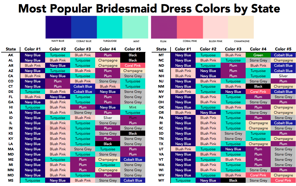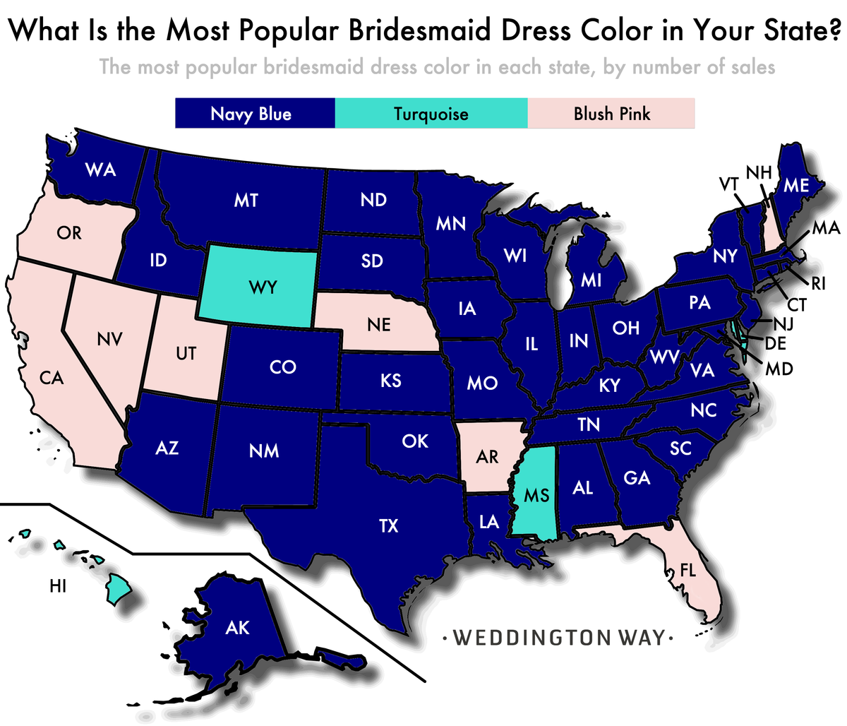 As it turns out, in 42 of the 50 U.S. states, blue is the most popular color group for bridesmaid dresses. In particular, navy blue is favored in 28 states, blush pink is preferred in 8, and turquoise in 4. Interestingly, the majority of the west coast (California, Oregon, Nevada, and Utah) purchase pink dresses more than blue dresses.