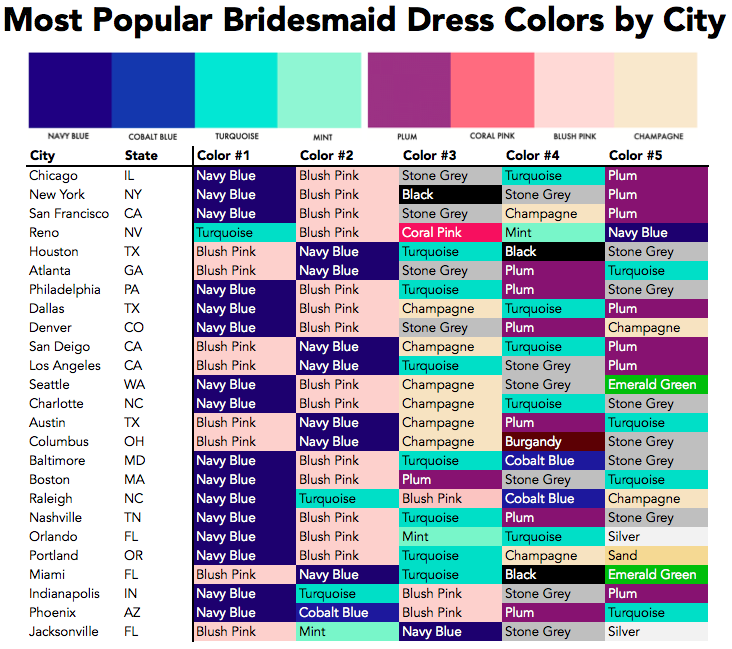 While the list above shows the five most popular bridesmaid dress colors in each city, what it doesn’t show is the plethora of unusual colors hidden in the rest of the data.