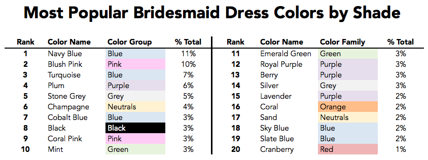 Blue (as a general color group) is by far the most popular choice, making up 26% of all bridesmaids dresses nationally. This far outpaces traditionally “feminine” colors like pink (15%), purple (14%), and yellow (3%).