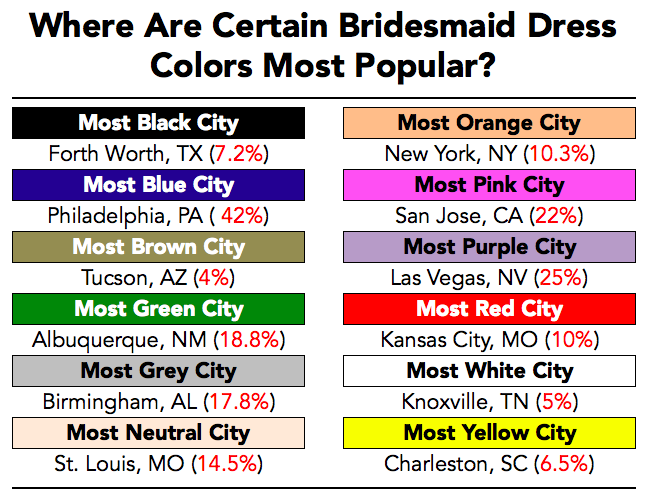Where, for instance, do the most bridesmaids wear orange-colored dresses? Or purple? Below, we’ve listed the city where each color group is the most represented, along with the percentage that color makes up of the total dresses purchased there.