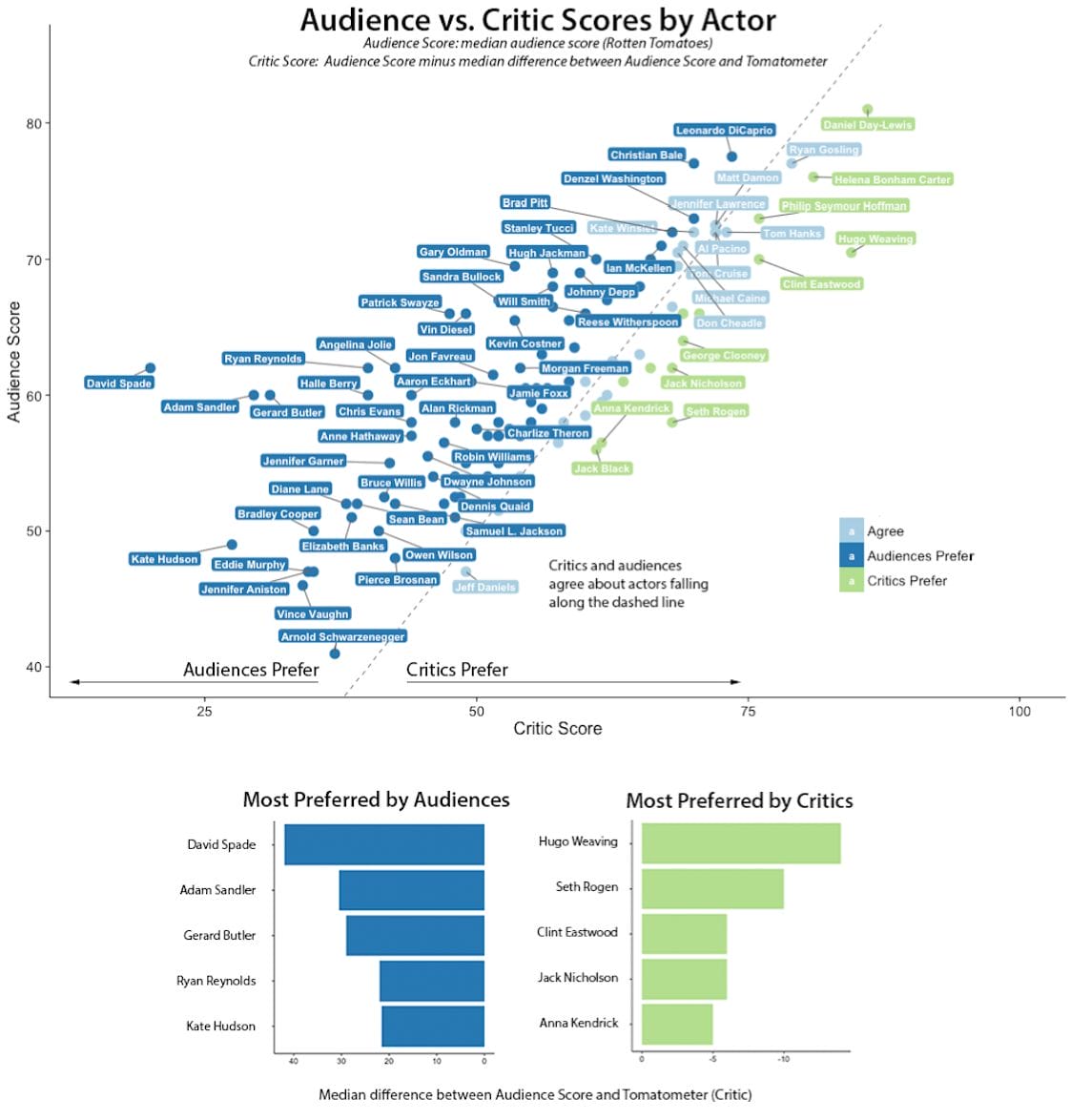Audiences love David Spade, Adam Sandler, Gerard Butler, Ryan Reynolds and Kate Hudson a whole lot more than critics do. Critics, however, prefer Hugo Weaving, Seth Rogen, Clint Eastwood, Jack Nicholson and Anna Kendrick.