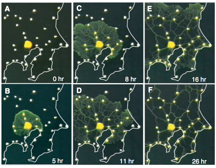 Slime mold, urban planning. Image from "Rules for Biologically Inspired Adaptive Network Design" by Atsushi Tero et al.
