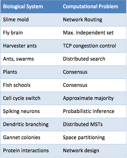Biological systems and their computational analogs in "Distributed Information Processing in Biological and Computational Systems" by Saket Navlakha and Ziv Bar-Joseph. Published in Communications of the ACM.