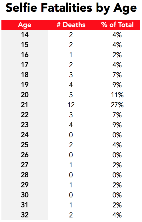 Polls have shown that 30% of all photographs taken by 18 to 24 year-olds are selfies — the highest percentage of any age bracket. So the average age here (21) doesn’t come as much of a surprise: it makes sense that the demographic taking the most selfies also perishes the most in the process.