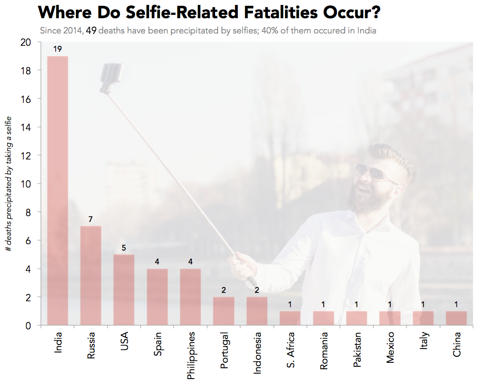 While selfie deaths have received a fair amount of coverage (last year’s viral post about how more people die from selfies than shark attacks comes to mind), the extent of the problem, and the data behind it, hasn’t been appropriately explored.
